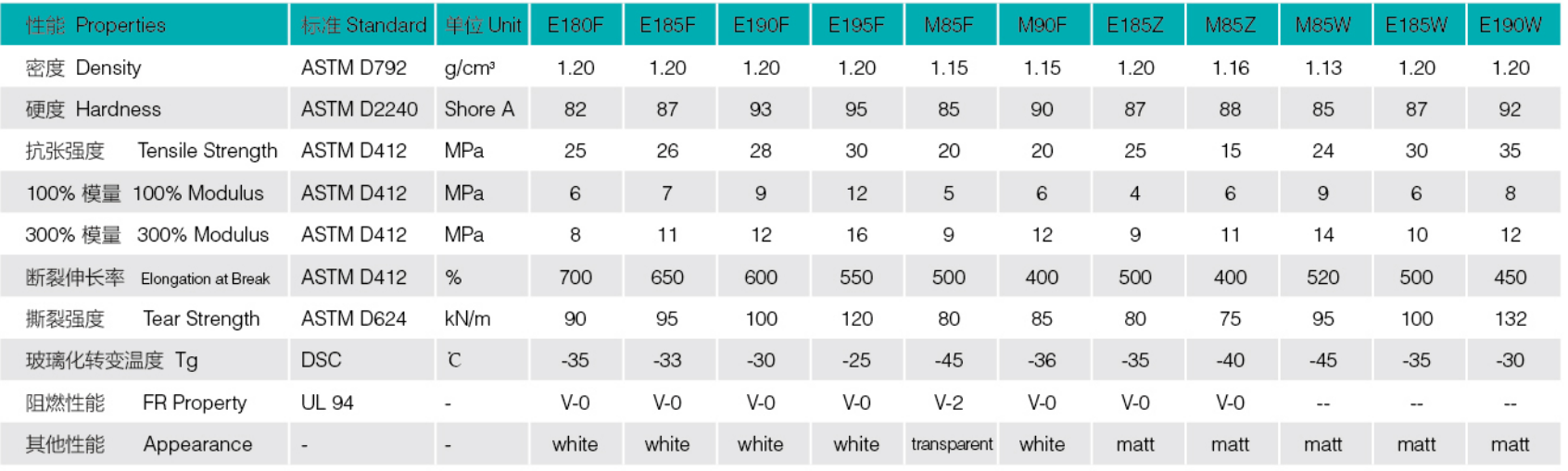 Features: Ether/Ester, Halogen-free Flame Retardant, Matte Effect, Excellent Hydrolytic Resistance, Low Temperature Flex心lity, Abrasion Resistance, Low Smoke & Toxicity, Good Thermal and Oil Aging Performance